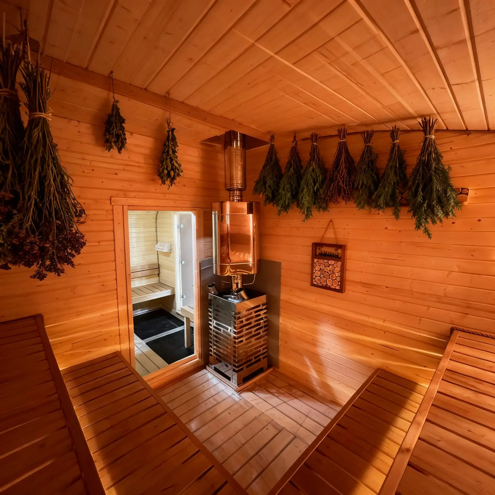 Топка внутри парной. Классика жанра: вы подкидываете дрова, не отрываясь от процедур, и наблюдаете за игрой огня через стекло печи прямо в парилке.