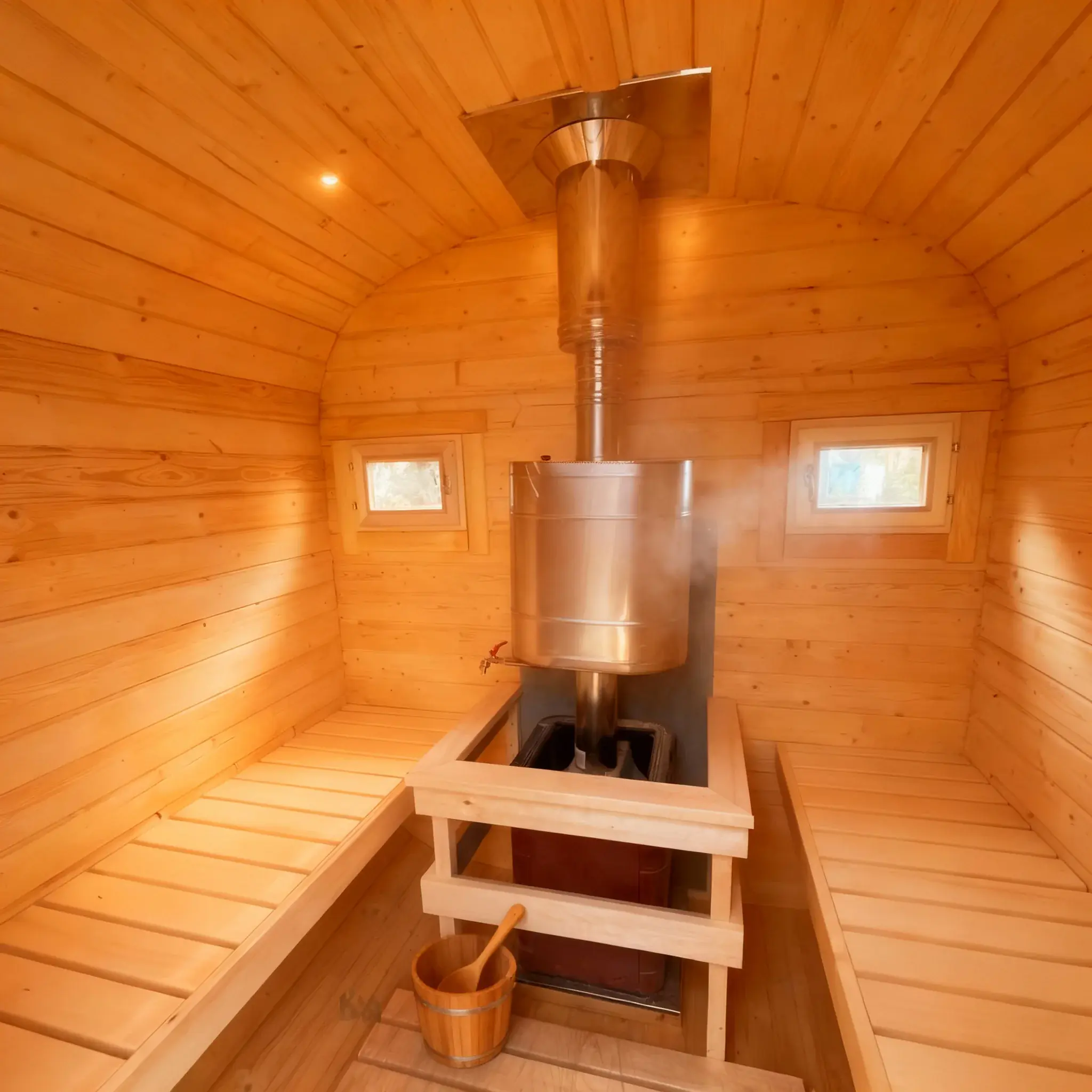 Топка внутри парной. Классика жанра: вы подкидываете дрова, не отрываясь от процедур, и наблюдаете за игрой огня через стекло печи прямо в парилке.