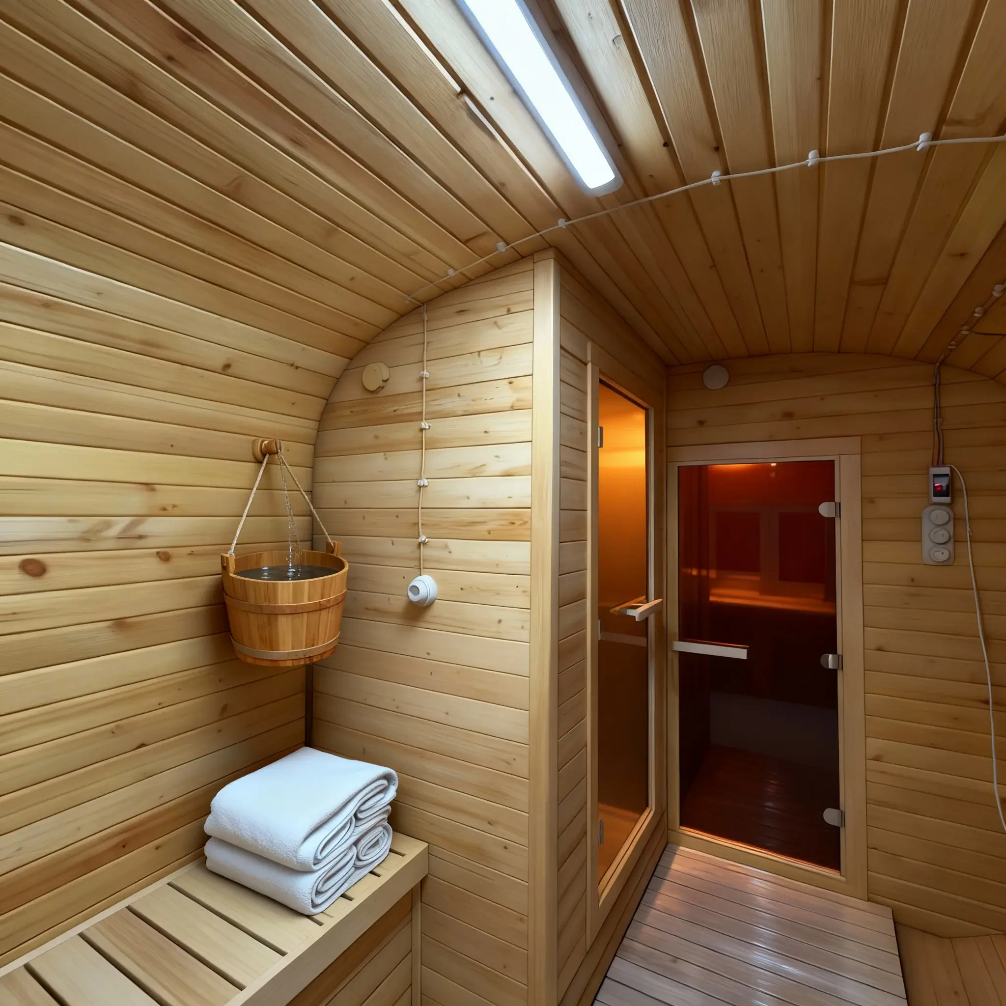 Душевая, совмещённая с проходом из парной — удобный лаконичный маршрут. Включает: разуклонный пол с гидроизоляцией и сливом — надёжная защита от влаги на годы вперёд.