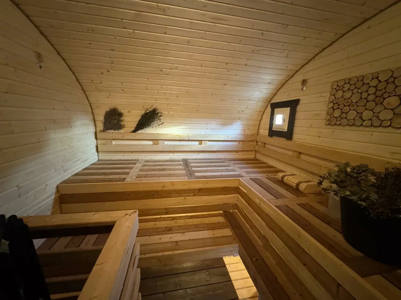 Топка внутри парной. Классика жанра: вы подкидываете дрова, не отрываясь от процедур, и наблюдаете за игрой огня через стекло печи прямо в парилке.