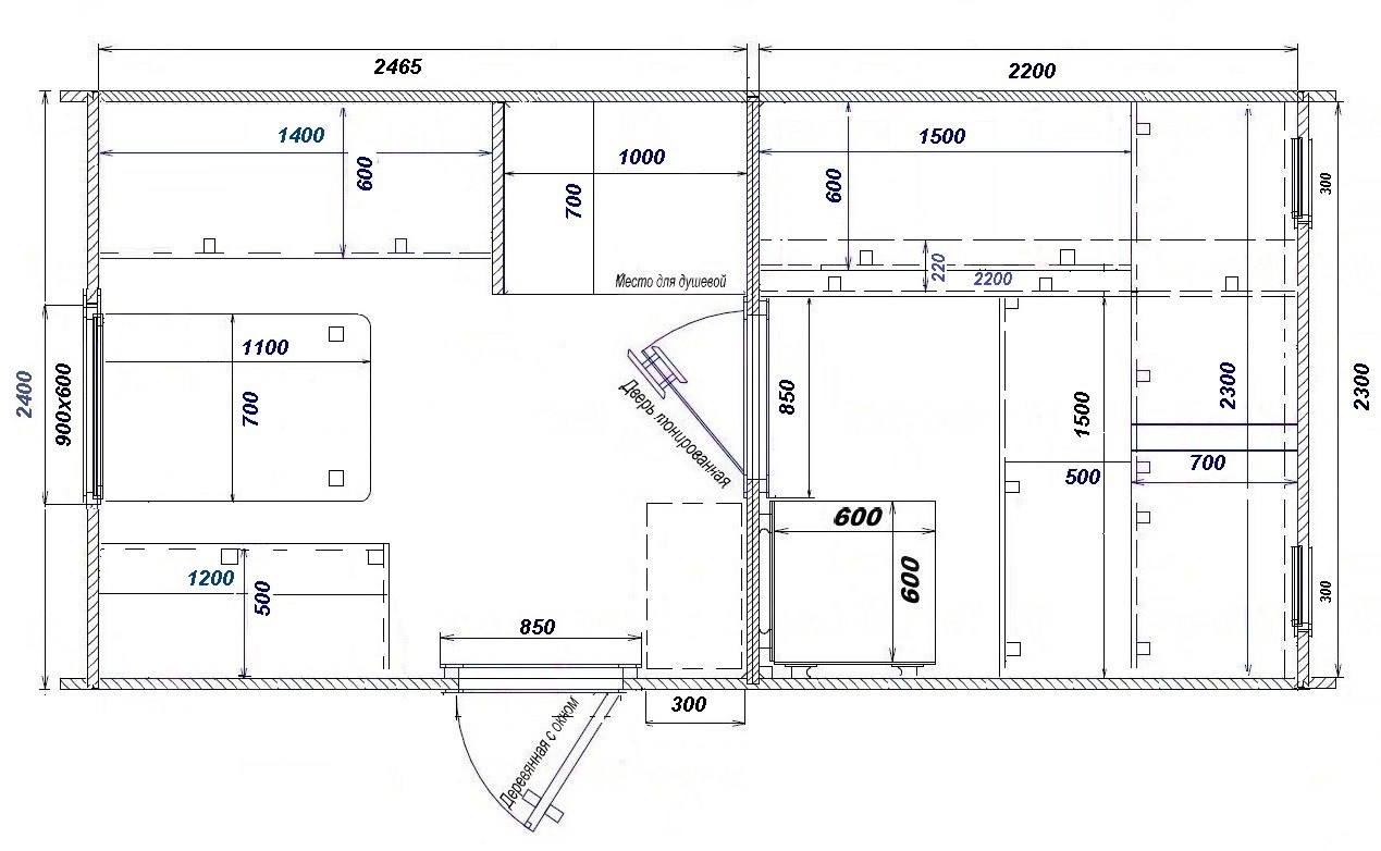 - Мебель в комнате отдыха: стол и лавки
